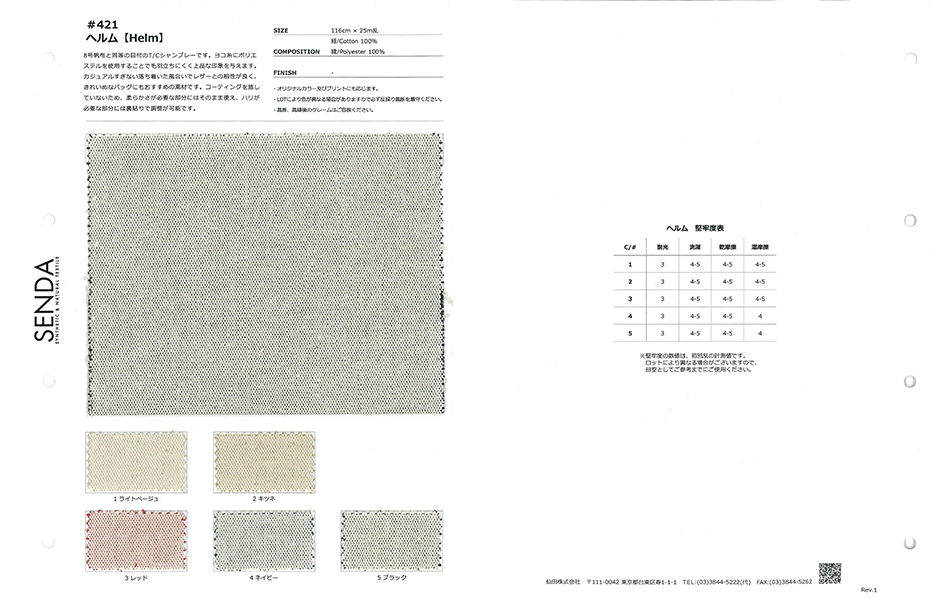 素材:ポリエステル60%、綿40% (タテ:C100%、ヨコ:PE100%) 生地幅:116cm巾 巻き数:25m乱 色数:全5色 特徴:T/Cシャンブレー