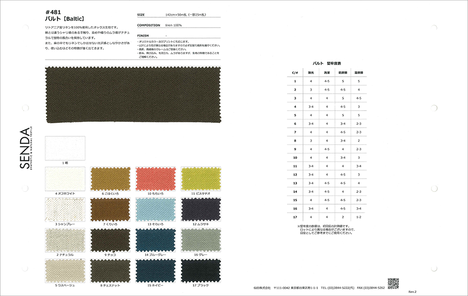 素材:リネン(100%) 生地幅:142cm 巻き数:25m乱 色数:全17色 特徴:-